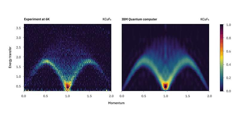 In new preprint, a team of researchers from Oak Ridge National Lab’s (ORNL’s) Quantum Science Center (QSC), Purdue University, Los Alamos Laboratory, the University of Illinois at Urbana-Champaign, the University of Tennessee, and IBM used quantum simulation to compute the energy-momentum spectrum of a well-studied magnetic material, KCuF3, showing strong agreement with the spectra measured via neutron scattering. The research is published on the arXiv preprint server.